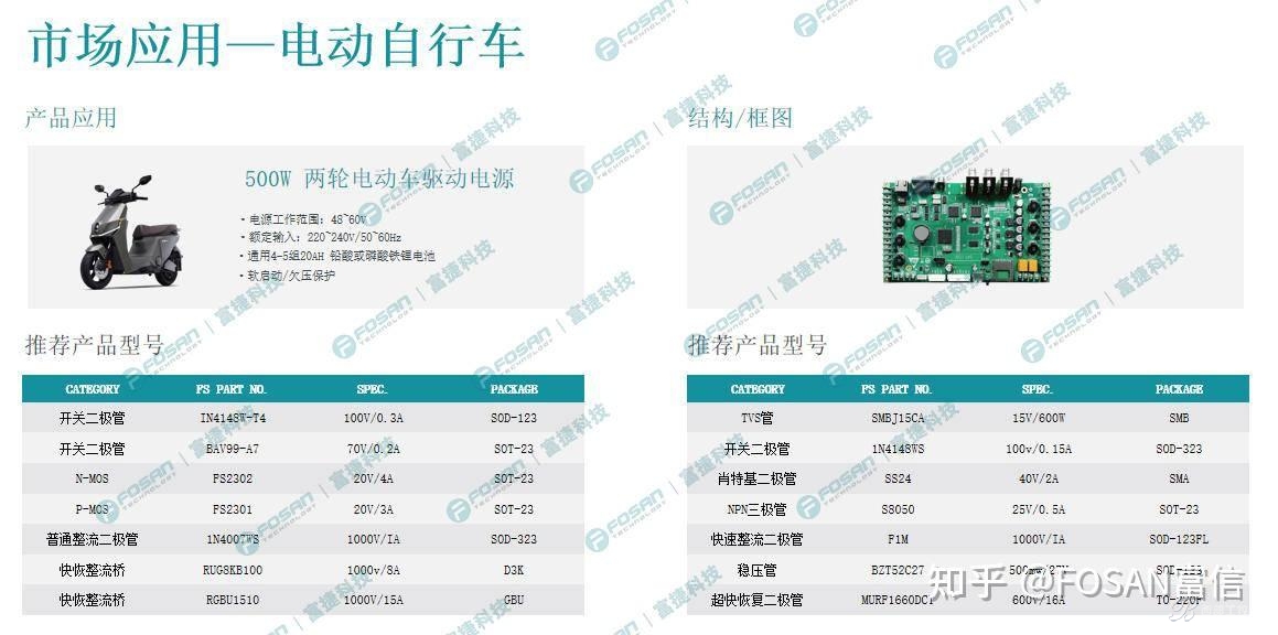 針對電動(dòng)自行車的動(dòng)力與電源管理需求,富信半導(dǎo)體為 500W 兩輪電動(dòng)車驅(qū)動(dòng)電源提供定制化元件方案,適配 48-60V 工作范圍,兼容 4-5 組 20AH 鉛酸 / 磷酸鐵鋰電池,具備軟啟動(dòng)、欠壓保護(hù)功能。