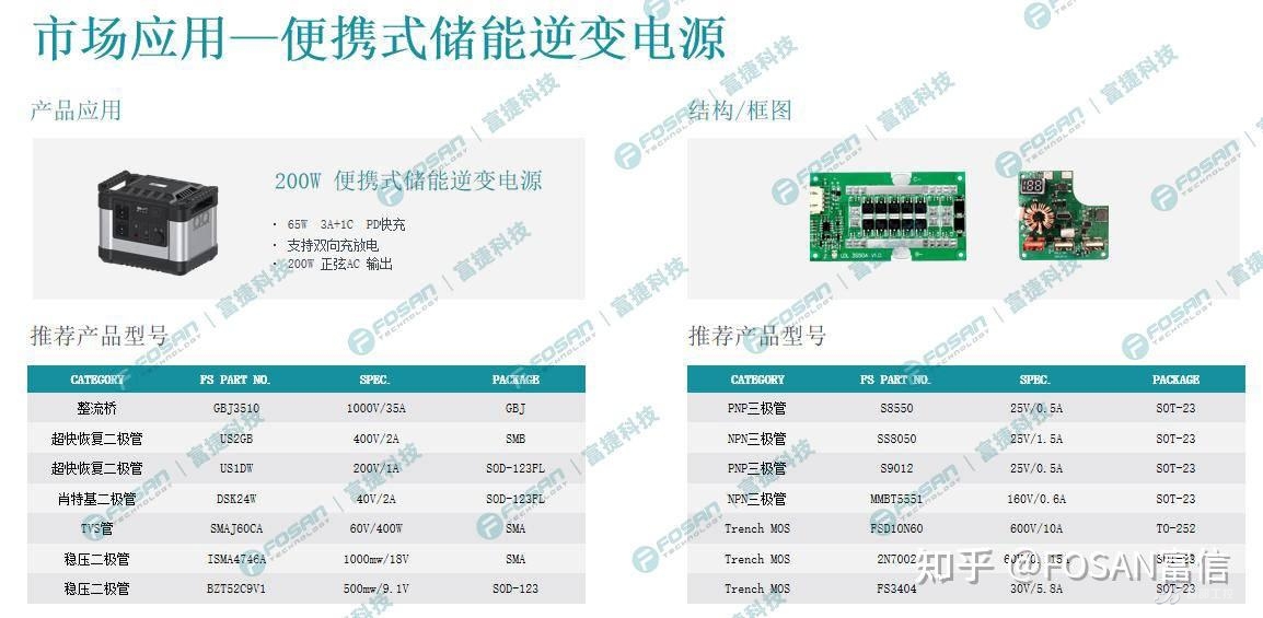 針對便攜式儲(chǔ)能逆變電源的移動(dòng)化、高效化需求,富信半導(dǎo)體提供適配 200W 正弦 AC 輸出、支持 65W PD 快充及雙向充放電的元件解決方案,為戶外露營、應(yīng)急供電等場景提供穩(wěn)定電力支持。